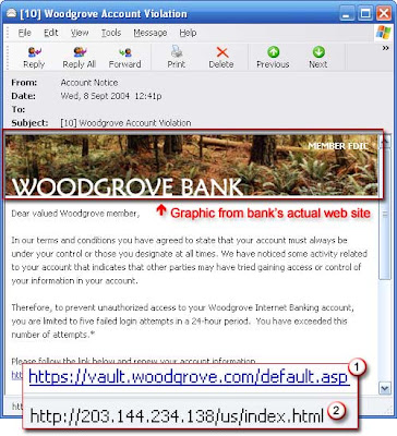 Example of a phishing e-mail message, which includes a deceptive Web address that links to a scam Web site.Here are a few phrases to look for if you think an e-mail message is a phishing scam.