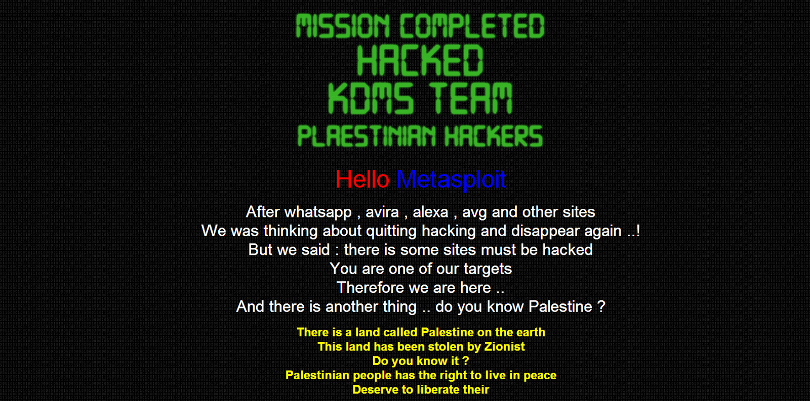 Palestinian hackers of KDMS Team, the ones that have defaced numerous high-profile domains over the past days through DNS poisoning, have hijacked metasploit.com, the website dedicated to the popular penetration testing software Metasploit. They've also defaced Rapid7's website, rapid7.com.