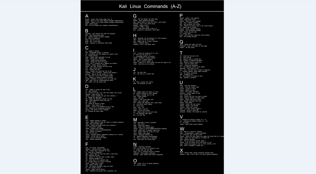 Kali Linux commands cheat sheet. All basic commands from A to Z in Kali Linux has been listed below.