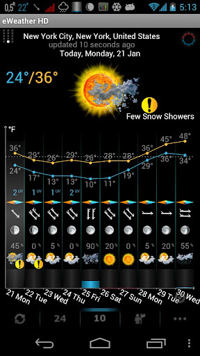 Elecont Weather (eWeather HD) is the most informative Android application about the environment: Current weather and weather forecasts from different weather providers, NOAA weather alerts, latest earthquakes, live radar, geomagnetic storm forecast, pressure change indicator and moon and sun calendar, METAR