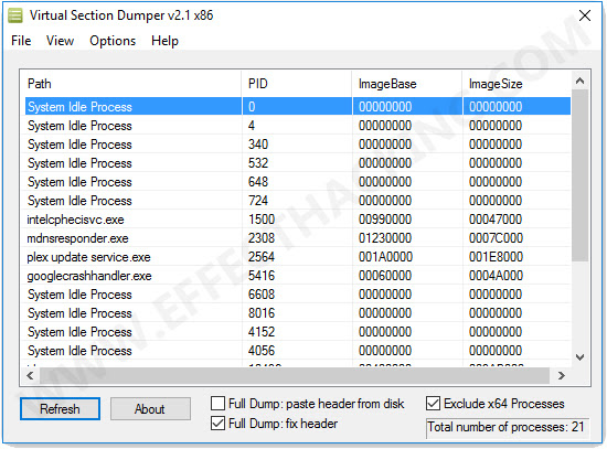 First, download Virtual Section Dumper onto your computer (download links are at the end of this article). Then run it (with administrator privileges). You will see a window as shown below.