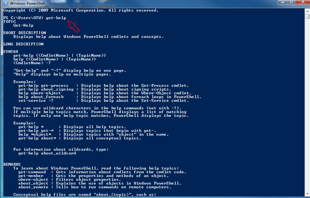 One of the key differences between Windows PowerShell and the BASH shell in Linux is that Microsoft has developed cmdlets (command-lets) for PowerShell. They cmdlets are essentially single commands that accomplish sometimes more complex tasks, similar to functions. These cmdlets take the form ofverb-noun, such as "get-help".