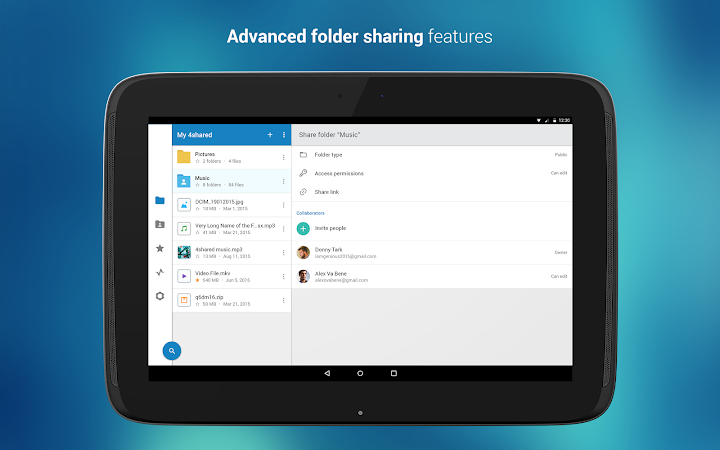 • A possibility to manage your account at 4shared.com, listen to music and even watch videos directly on your Android device.