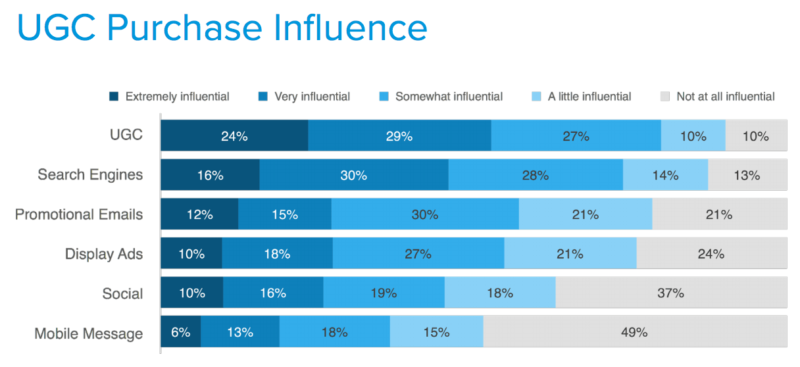 In one of the more interesting findings, consumers said they were inclined to spend more on a product with UGC vs. a comparable lower-priced product without. This directly argues that consumers will buy more and at higher price levels if products are wrapped in UGC.