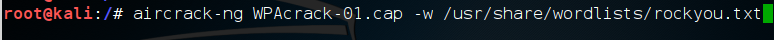 kali > aircrack-ng WPAcrack-01.cap -w /usr/share/wordlists/rockyou.txt