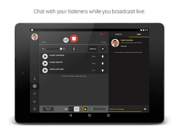 Spreaker Studio transforms your device into a fully-equipped radio studio, allowing you to broadcast live or pre-record podcasts while adding tracks and sound effects.
