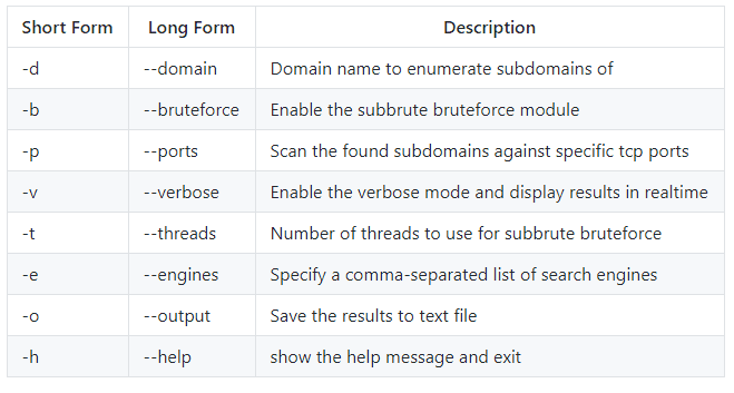 * To list all the basic options and switches use -h switch: python sublist3r.py -h