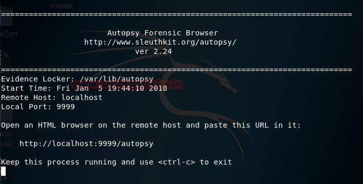 It is used to investigate disk images. When you click on Autopsy, it starts the service and its user interphase can be accessed on the web browser at https://9999:Localhost/autopsy. It gives the user a full range of options required to create a new case file: Case Name, Description, Investigators Name, Host name, Host time zone, etc.